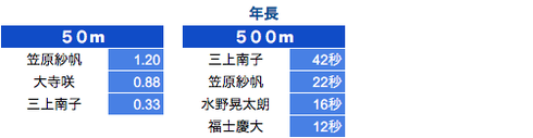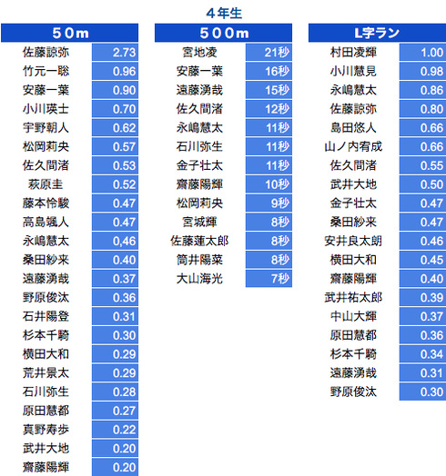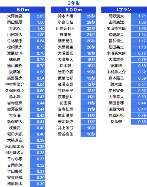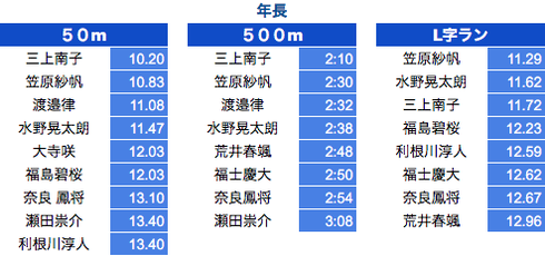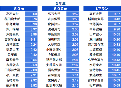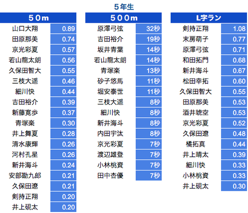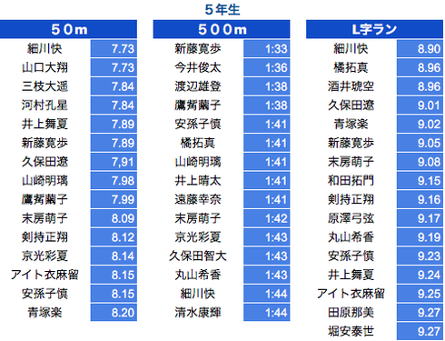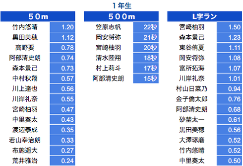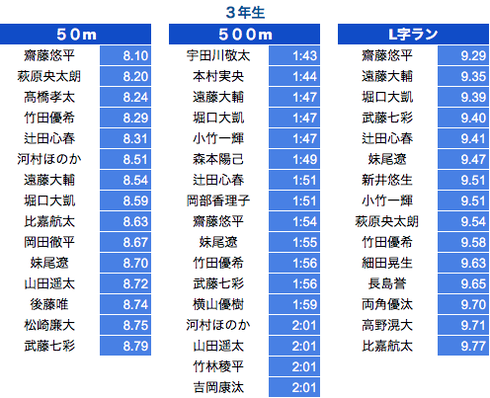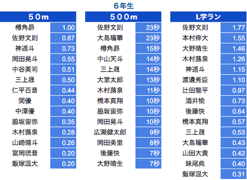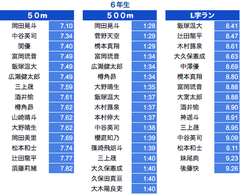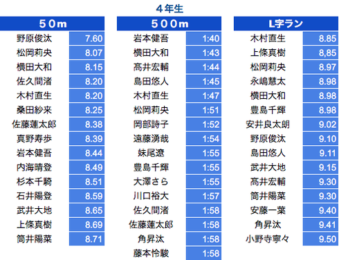 *500M:1年生〜3年生は10秒以上、4年生〜6年生は7秒以上を掲載しております。