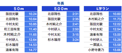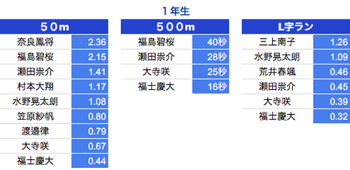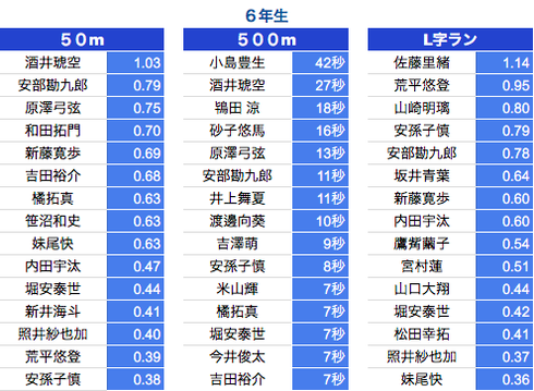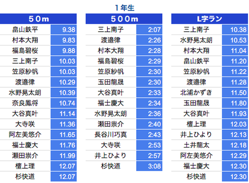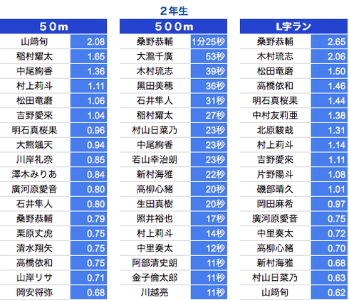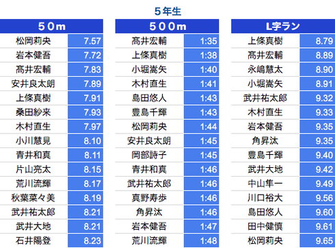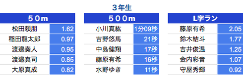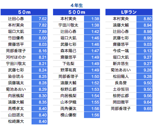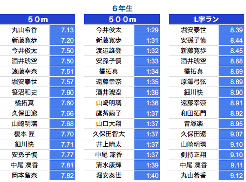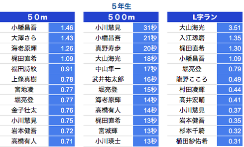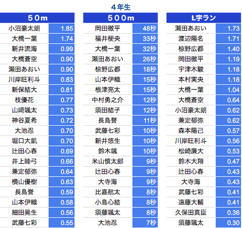 *500M:1年生〜3年生は10秒以上、4年生〜6年生は7秒以上を掲載しております。