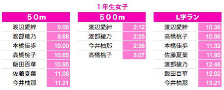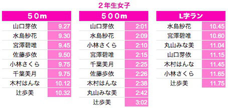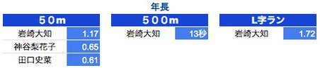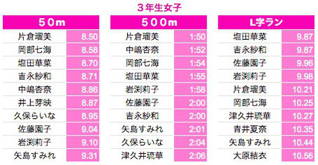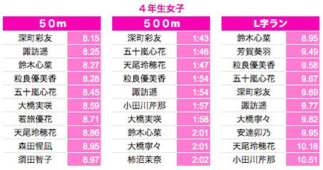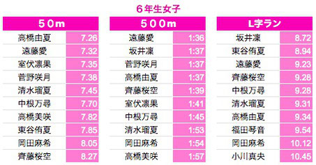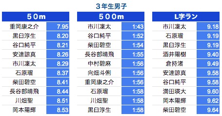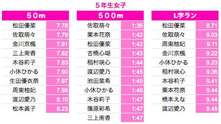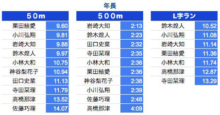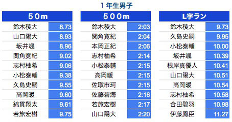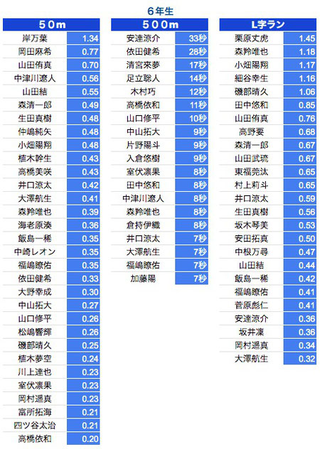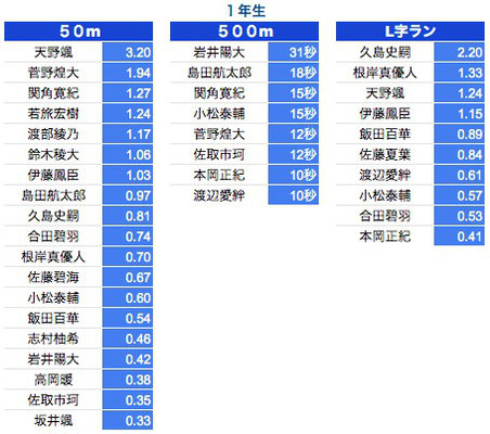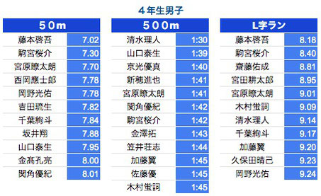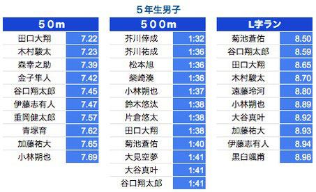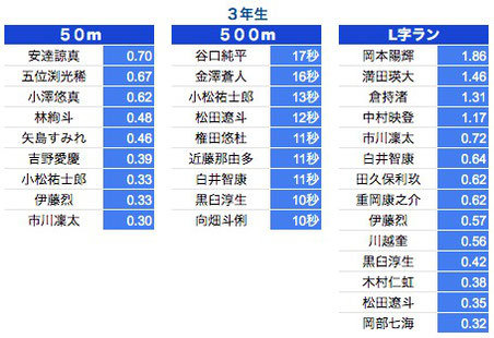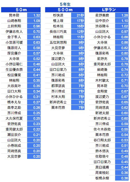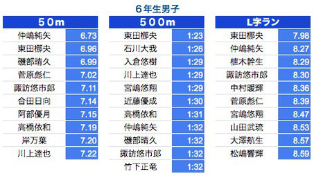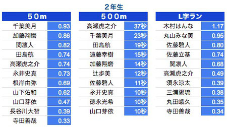 *500M:1年生〜3年生は10秒以上、4年生〜6年生は7秒以上を掲載しております。