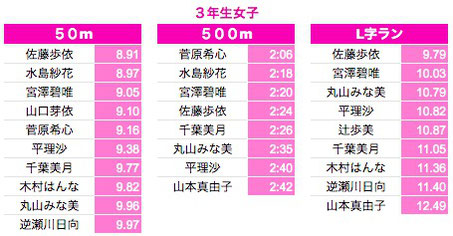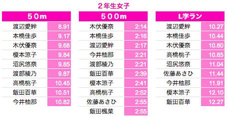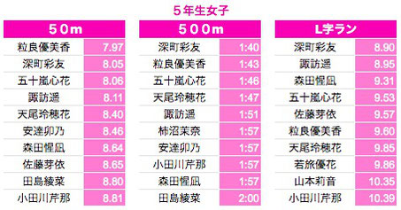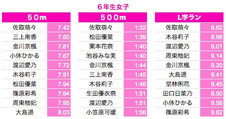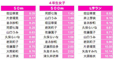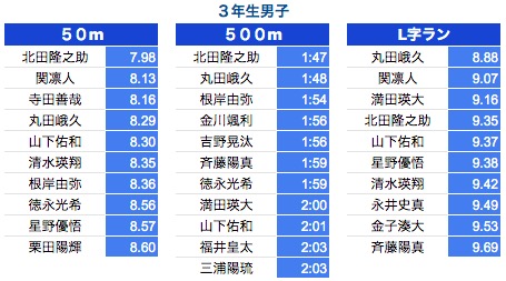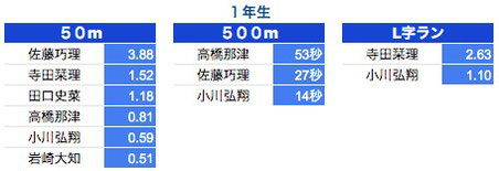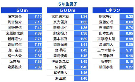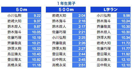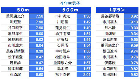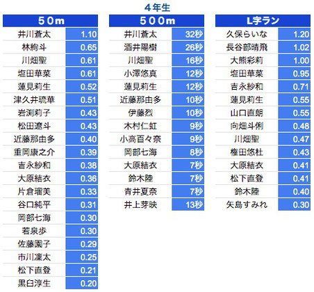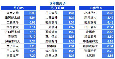 *500M:1年生〜3年生は10秒以上、4年生以上は7秒以上を掲載しております。
