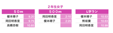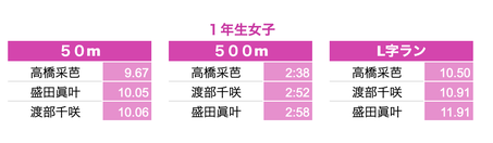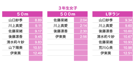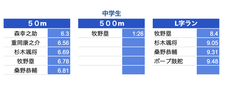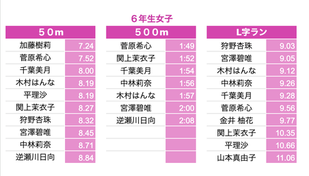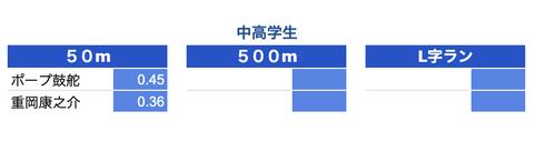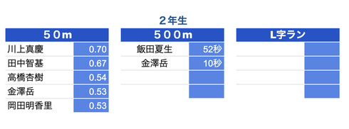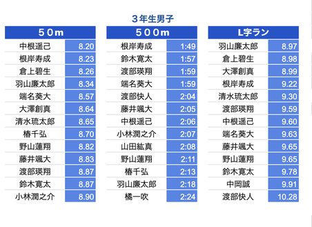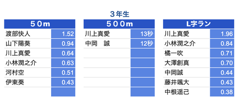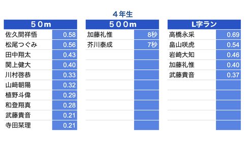 *50M:1年生〜3年生は0.3秒以上、4年生以上は0.2秒以上を掲載しております。