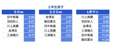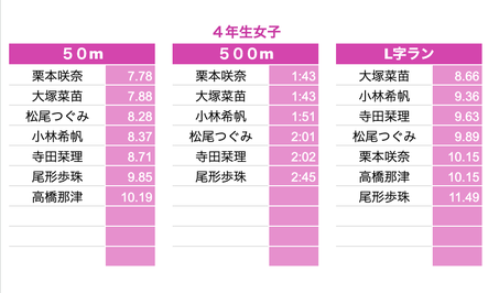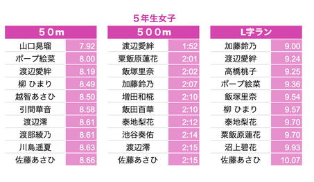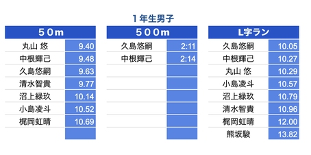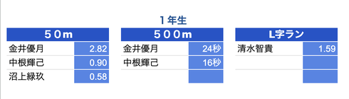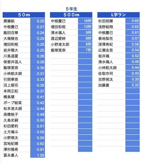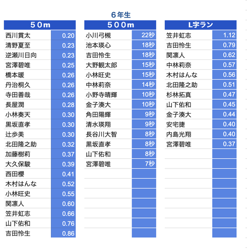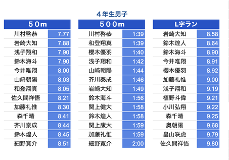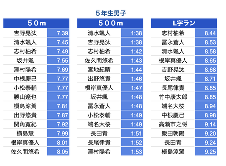 *500M:1年生〜3年生は10秒以上、4年生以上は7秒以上を掲載しております。